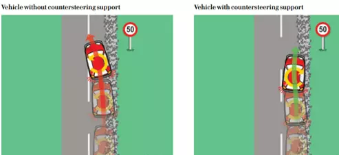 Hệ thống sẽ tác động vào motor trợ lực lái trong một số trường hợp khẩn cấp. Ví dụ khi lái xe trong trên địa hình có độ bám bên trái và phải khác nhau. Thông thường điều đó dễ làm cho đầu xe bị lệch qua một phía. Khi đó hệ thống sẽ áp dụng trợ lực phù hợp để giúp xe ổn định lại quỹ đạo