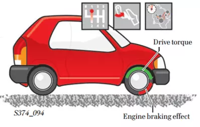 Trong trường hợp đột ngột nhả chân ga hoặc sang số thấp khi đang điều khiển xe. Bướm ga đóng, công suất động cơ giảm. Lực ma sát gây nên hiện tượng phanh động cơ, chống lại tác dụng của lực kéo. Khi đó bánh xe sẽ bị khoá cứng và không điều khiển được. Hệ thống sẽ can thiệp bằng cách mở bướm ga trong khoảng nhất định để duy trì lực kéo, giúp bánh xe quay tối ưu với tốc độ xe. Và nhờ đó có thể đánh lái và điều khiển xe ổn định